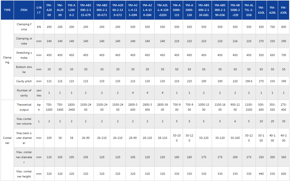 The company adopts Germany advanced technology to develop YM-A series PET Automatic blow molding machine with manual feeding preform. From one cavity to four cavities,It’s suitable for producing PET plastic containers and bottles in all shapes below 30Liter, such as Cooking Oil bottle, Water bottle, Wide-mouth bottle, Pesticide Bottle,etc. The machine has the advantages of accurate positioning, stable performance, higher rate of good products, high capacity, power consumption,low noise,wide application and easy operation.